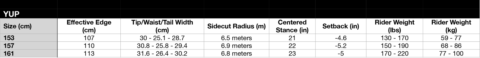 YUP[ヤップ]は、Channel Systemを取り入れ、オールマウンテンでのカービングの正確さを求めてデザインされた、卓越したディレクショナル形状のドリーム・マシンです。テーパード・ディレクショナル・サイドカットとトップレベルのベース、そして楽な滑りを可能にする最高級のマテリアルを搭載したスペシャルボードです。