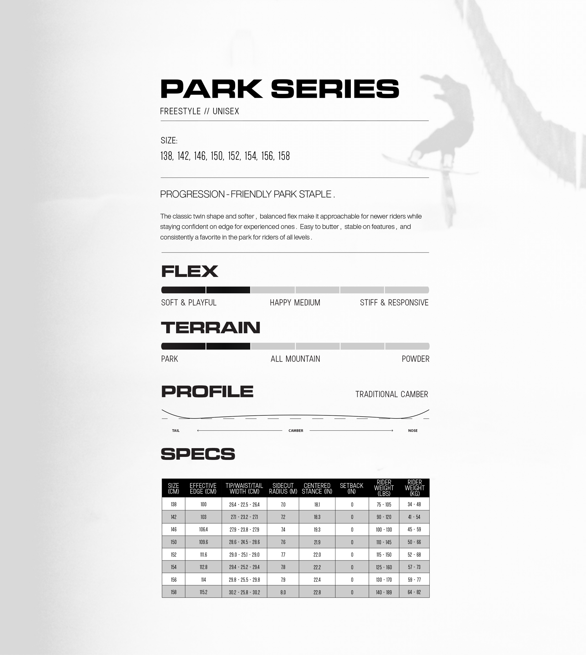 signal snowboardのラインナップの中で一番柔らかいフレックスのPARKseries。サイズバリエーションも幅広く、男女問わず乗りこなすことができるunisexモデルで、ソウタも愛用するフリースタイルツインボードだ。適度な反発と取り回しのし易さは、ジブやジャンプをスキルアップしていきたい人達にも最適なボードスペックになっています。
