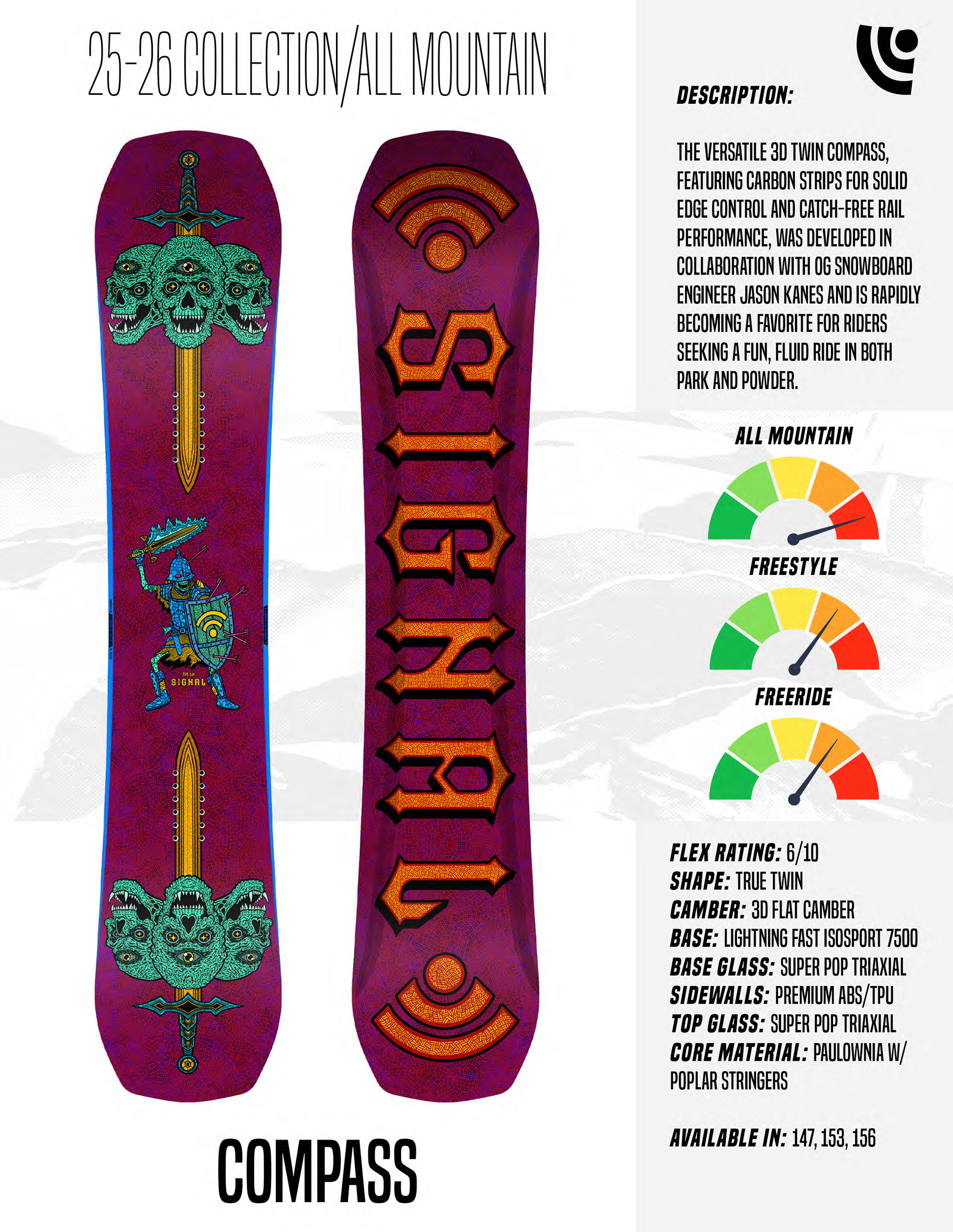 エッジコントロールとキャッチフリーレールパフォーマンスのためのカーボンストリップを特徴とする万能な3DツインのCOMPASS[コンパス]は、スノーボードエンジニアのジェイソン・ケインズとのコラボレーションにより開発され、パークとパウダーの両方で楽しく流れるようなライディングを求める乗り手の間で急速に人気が高まってモデルとなります。